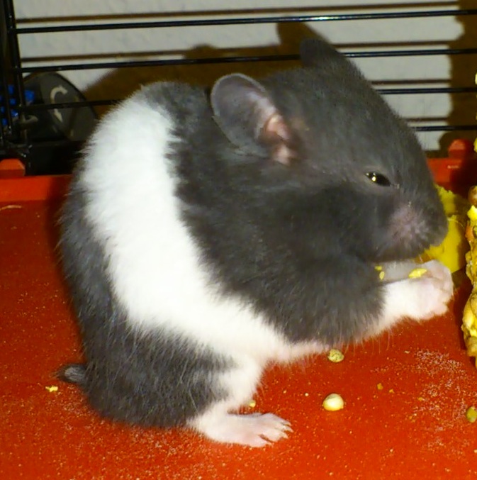 Vi vil også gerne med og have Perry med (sort hvid båndet guldhamster) men vi er meget nye i hamster-verdenen og Perry er kun 2 mdr den 9. april så måske er han næsten for ung?