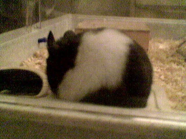 - Det var her han sov på ryggen i skålen... Lidt svært at se.. det lyserøde er poter, snude og hale!!