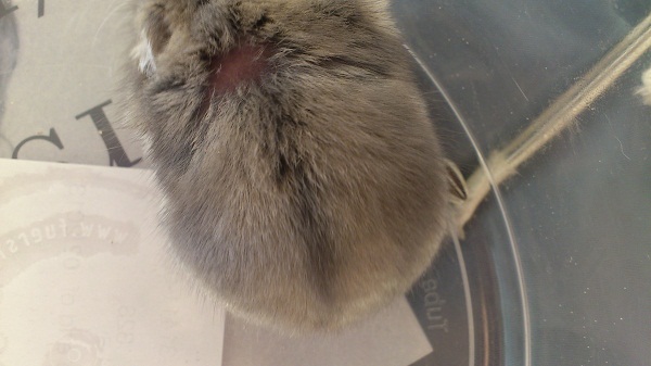 I dag opdagede jeg at min vinterhvide unge på 1 måned og 3 uger havde en bar plet på ryggen. I kan se billeder af det nedenfor.